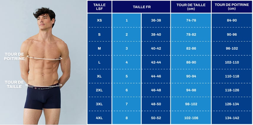 To ensure comfort in your underwear, pajamas, clothing, or swimwear from Le Slip Français, check our size guide. It provides our recommendations based on your body type (weight and height).
