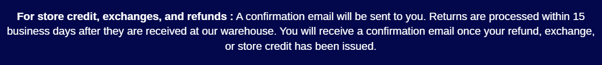 At the Warehouse: Your return has been received at our warehouse and is ready to be processed. This step can sometimes take up to 15 business days, as each return is carefully inspected, which may slightly extend the processing time.